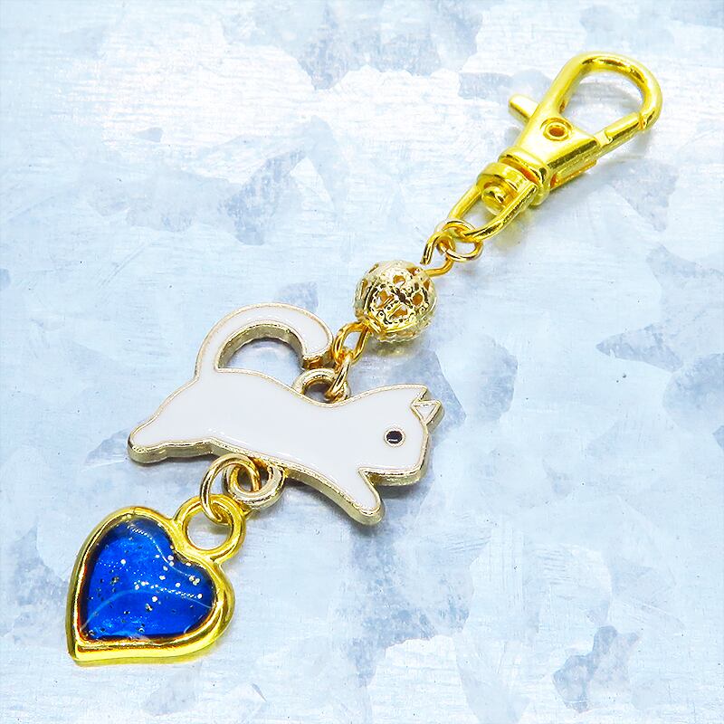 跳び白猫とブルーハートの大人可愛いキーホルダー エナメル ゴールドメタルビーズ マリンブルーレジン 金具変更可