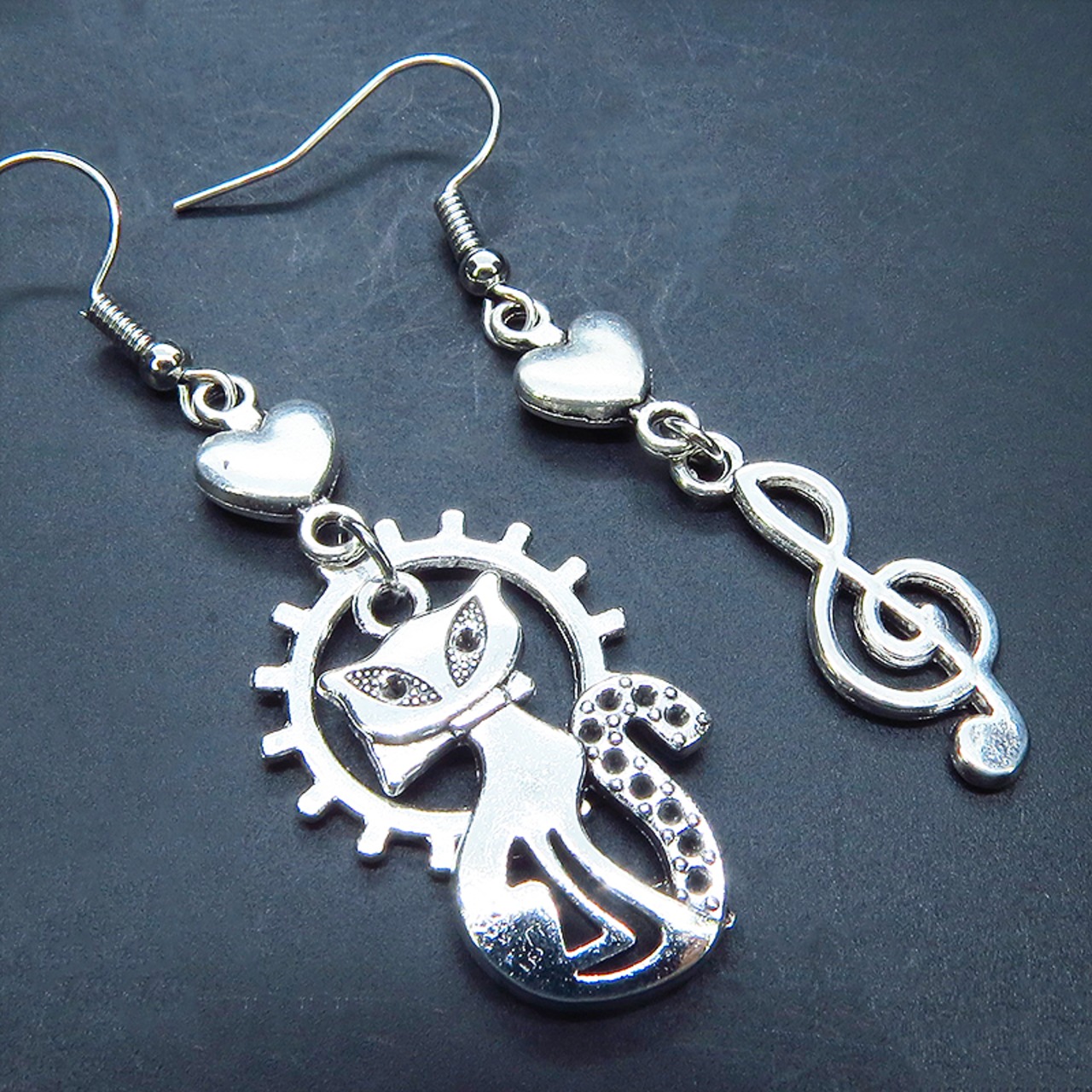 アンティークシルバー オリエンタル風の猫と音符のチャーム組合せたアシンメトリーピアス ハート