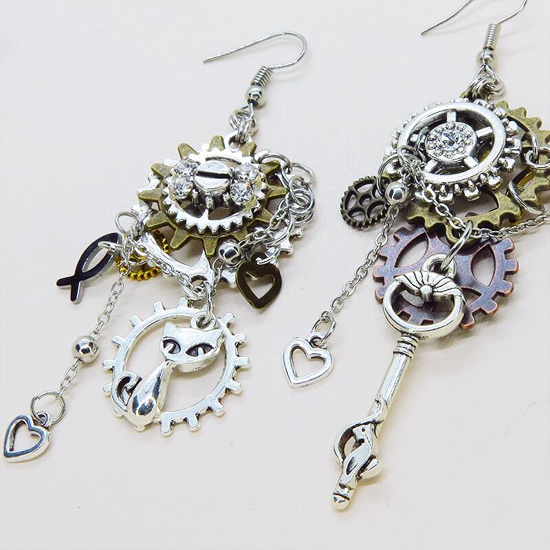 アンティークシルバー 猫と歯車のスチームパンク風の多層的アシンメトリーピアス サージカル可