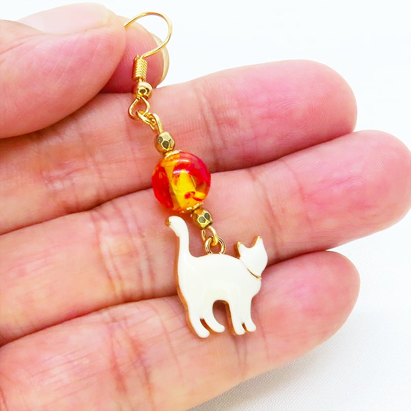 歩き猫シルエットモチーフとオレンジイエロークリアビーズを組合せた大人可愛いピアス マットゴールド エナメル サージカル可