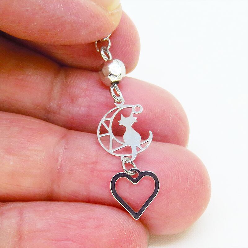 シルバーカラー 猫が乗る透かし三日月とオープンハートのピアス サージカル可
