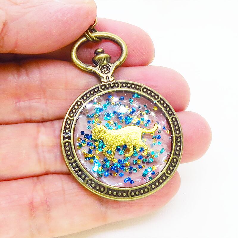 アンティークな懐中時計に閉じ込められた可愛い猫のキーホルダー